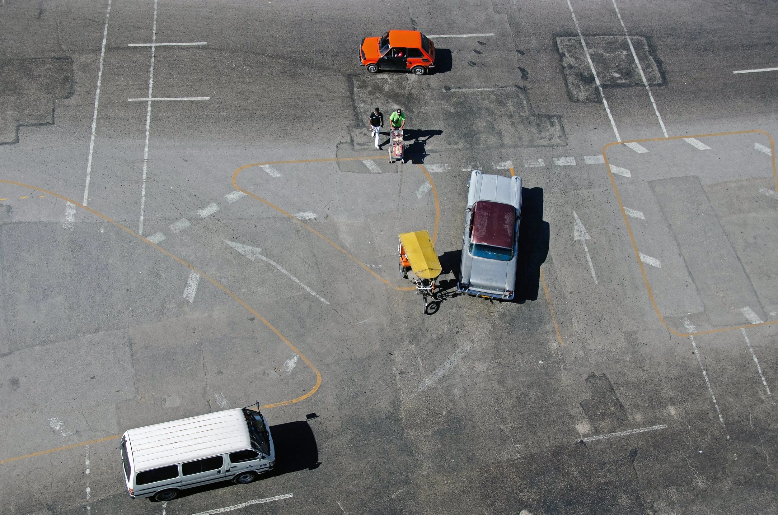 At the time, I didn’t have much of a framework for working through that. I photographed instinctively, responding to what was in front of me rather than making deliberate choices; cars passing in opposite directions, people crossing wide open spaces, windows puncturing flat walls. Scenes arranging themselves briefly before dissolving again.