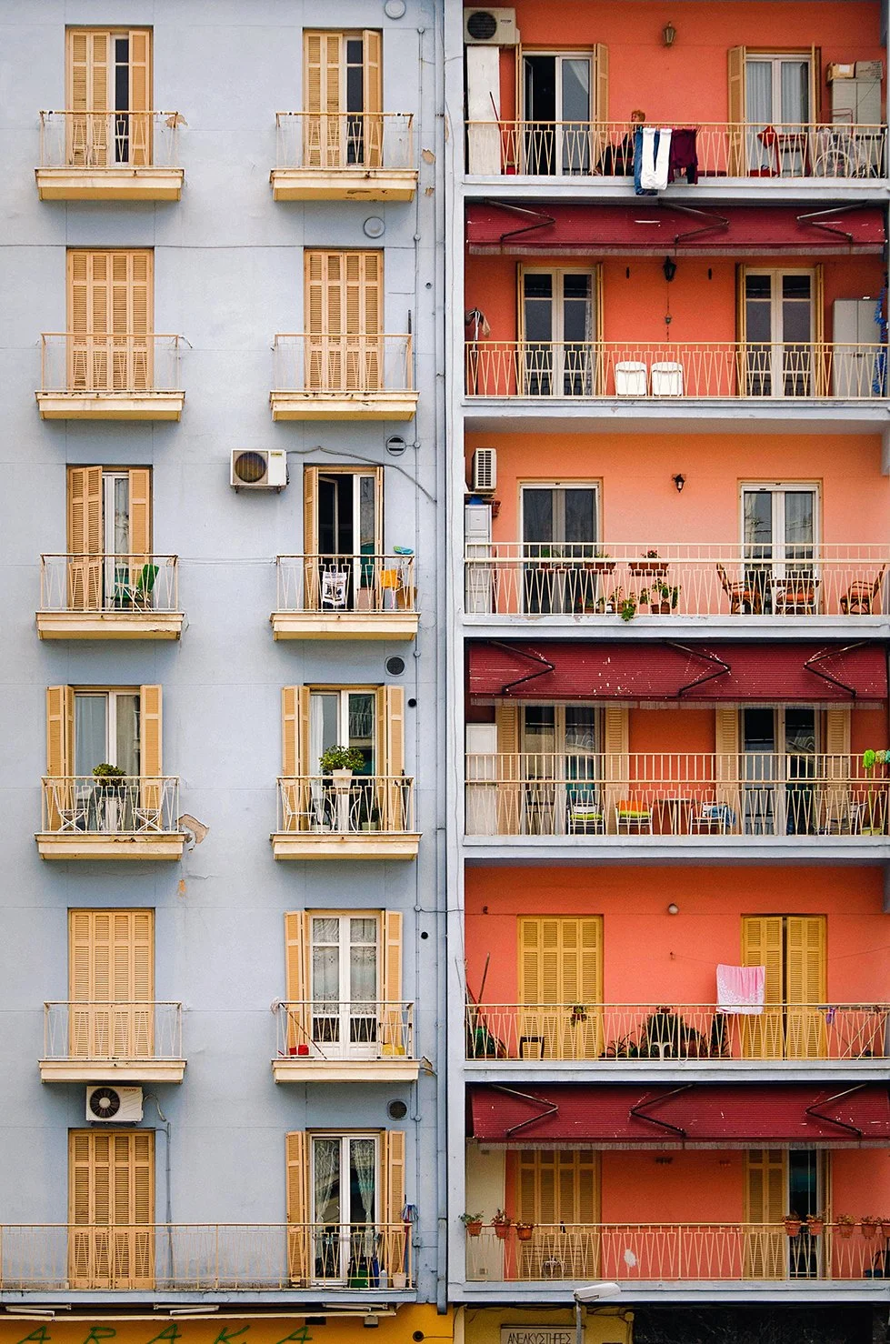 The geometry comes first. Rectangles within rectangles. Repetition. Symmetry that’s never quite perfect. Balconies stacked one above another, shutters aligned but slightly off, railings cutting across façades in predictable rhythms. There’s a calmness in these imperfect structures, a sense of things being held in place, but only just.