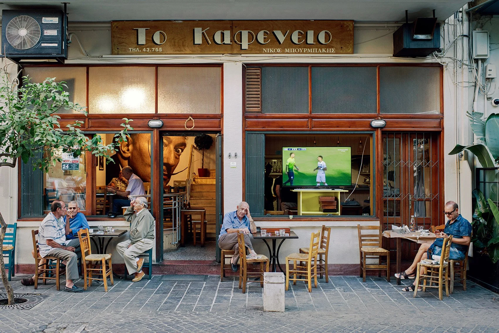A kafeneio becomes a place of looking in both directions. Inside, the eyes of Salvador Dalí. Outside, people with their own stories, positioned not as subjects but as part of the scene’s underlying order. a television glowing inside a Kafeneio while the street carries on outside. These aren’t clues to be solved, they’re simply traces, existing comfortably within the frame.
